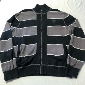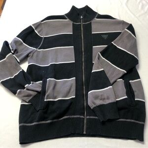 GUESS Grey & Black Long Sleeve Zip Up Striped Knit Cardigan Sweater Size Large