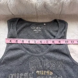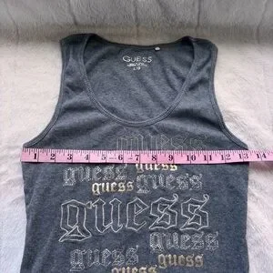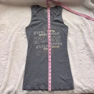 GUESS Grey Ribbed Tank Top Large Y2K Gothic Font Rhinestone