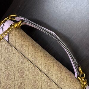Elegant Guess handbag with lavender trim. Cream interior with logo details. Gold-tone accents enhance style.
