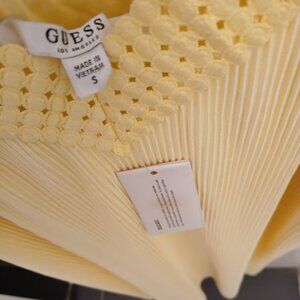 Stylish off shoulder dress in a bright lemonade color by GUESS . Pretty neckline details.
