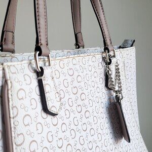 Chic and spacious GUESS monogram tote bag in a stunning beige/taupe colorway with all-over “G” logo print. Perfect for everyday use, work, school, or travel - stylish and practical.
