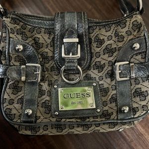 I I guess purse the inside is silk and the outside is almost like a beige and black Gucci print but guess brand . Silver buckles and self connecting buttons with a silver purse strap . Love this bag but it's time for a change and it deserves some love as it's been in my closet for a while !