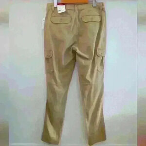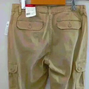 •	Style: stretch woven sateen cargo pants, medium rise, tapered fit and skinny leg, 6 pocket construction, front button and zip closure