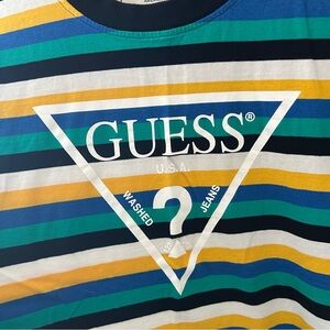 Stylish short sleeve tee with vibrant stripes. Features GUESS logo on front. Perfect for casual wear.