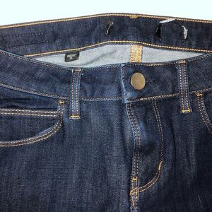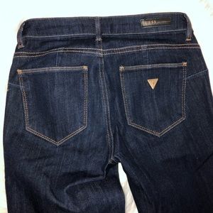 Guess mid rise denim in “Curve-X” style. Dark blue indigo wash with no fading and gold button hardware. Stretchy and comfortable. Size 25. Worn once. Excellent condition—only flaw is that the tag is cut off (see photo) because it was uncomfortable on my back.