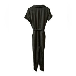 Olive green utility jumpsuit. Zip front closure. Short sleeves. Belt included. Multiple pockets. Relaxed fit.