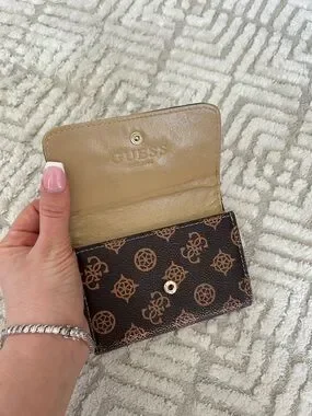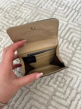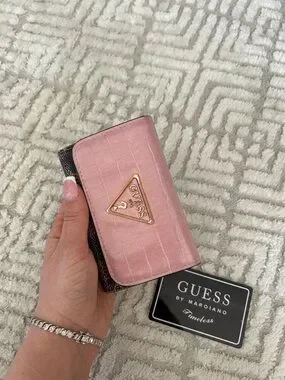 GUESS compact trifold wallet in soft croc-embossed pink. Features a gold-tone triangular logo plaque on front. Compact and chic for everyday use. Sleek design fits small bags and pockets.