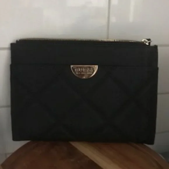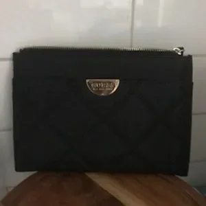 This black Guess pouch would be great as a travel pouch. Could hold passport, tickets, boarding passes, etc. There are some slots for credit/debit cards and zips up. Could also be used as a large wallet if you carry bigger bags or even as a clutch purse. Also has small wrist strap - So many uses. Size is approx. 9"W X 6"L