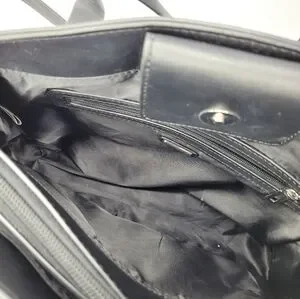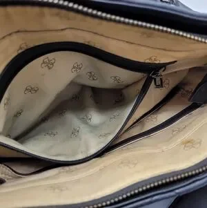 Some staining in the inside pocket and on inside fabric, silver plating on chains are wearing off, as seen in photos.