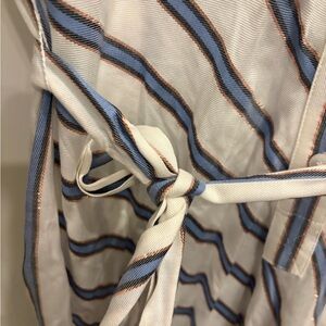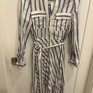 Chic, flattering, and effortless to wear — this Guess shirt dress is perfect for everyday style or dressing up. Features a crisp white base with navy + warm stripe detailing, button-front closure, chest pockets, long sleeves with cuff detail, and an adjustable waist tie for a flattering silhouette. The high-low hem adds shape and movement, giving it a modern, stylish finish. Brand new with tags!