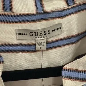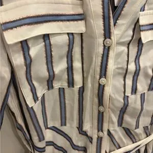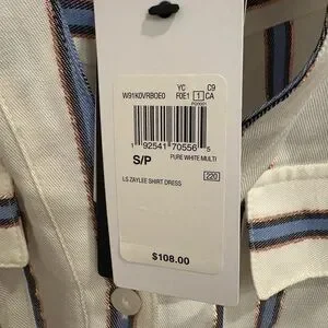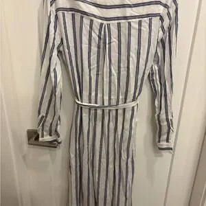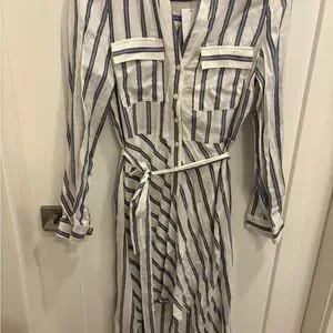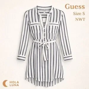Chic, flattering, and effortless to wear — this Guess shirt dress is perfect for everyday style or dressing up. Features a crisp white base with navy + warm stripe detailing, button-front closure, chest pockets, long sleeves with cuff detail, and an adjustable waist tie for a flattering silhouette. The high-low hem adds shape and movement, giving it a modern, stylish finish. Brand new with tags!