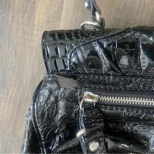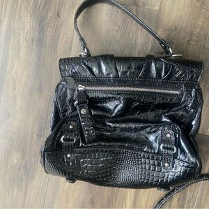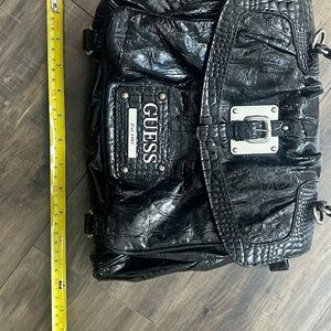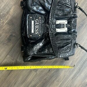 Elegant GUESS satchel with a glossy finish. Features a secure clasp and sturdy handle. Perfect for day or night.