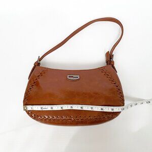 Vintage 2010s shoulder bag from iconic fashion house Guess. Narrow profile for comfortable under arm hold. Roomy pouch fits larger wallets, scarves, gloves, etc. Beautiful cognac brown faux leather finish with cross stitching accents along the seam lines. Gunmetal grey hardware on the shoulder strap and the "G" logo mark. Top zip closure. Inside lining has hidden side pocket with zip closure. Pre-owned in excellent condition. Like new.