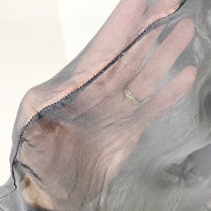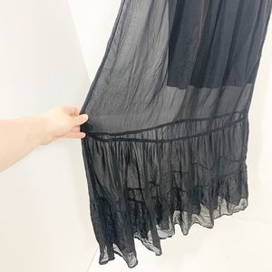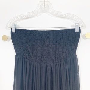Look chic in this black silk strapless maxi dress. Elastic cinched bust for comfort. Tiered seamed bottom layer. Double layer with the outer being silk and sheer, lining is shorter with stretch. Outer seams at the hip have been stretched as shown in last 3 photos and reflected in the price.