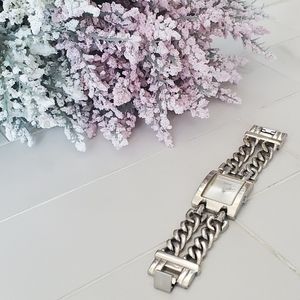 Classic silver chain watch. Rectangular face. Pre-Loved with condition shown in pictures. Small scratch on the face as shown in 4th picture. Needs a battery replacement.