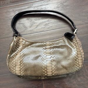Early 2000s glam at its finest. This GUESS baguette-style shoulder bag features a glossy snakeskin-embossed finish in taupe with black patent accents, a rhinestone-embellished logo turn-lock plate, and a sleek curved silhouette. Perfect for nights out or adding a pop of retro drama to any look.