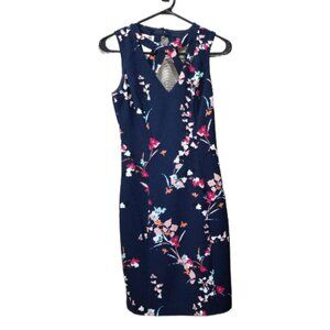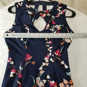 Elegant navy dress with vibrant floral patterns. Sleeveless design with a stylish cutout neckline. Perfect for any occasion.