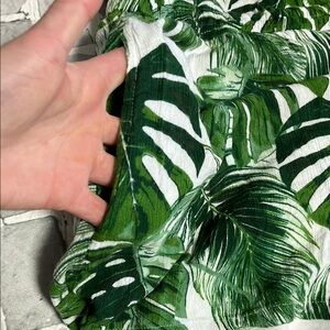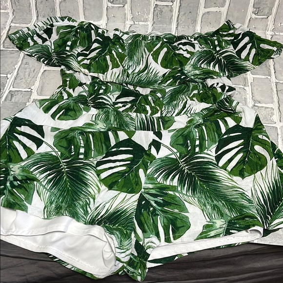 Stylish off-shoulder romper with a vibrant tropical leaf print. Perfect for summer outings.