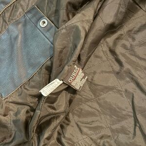 Stylish dark leather bomber jacket by GUESS. Features multiple pockets and ribbed cuffs. Perfect for a modern look. Size XL. In great but used condition. Rare model. Great quality jacket.
