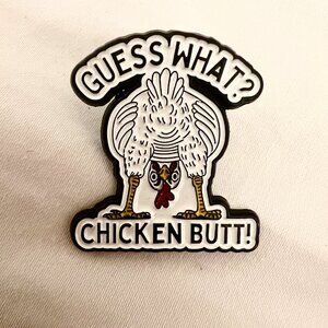 An awesome enamel pin, featuring a chicken with the caption "GUESS WHAT? CHICKEN BUTT!" Black backing.