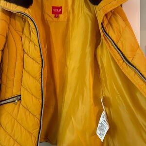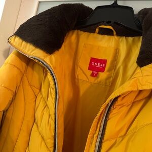 Warm dark yellow with brown faux-fur Guess coat size Small with pockets and golden zippers.