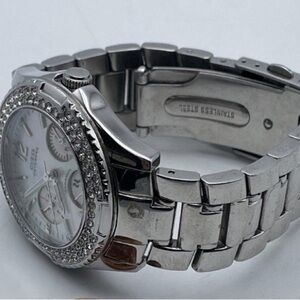 Add a touch of elegance to your wrist with this GUESS WaterPro Ladies' Watch. The silver stainless steel bracelet and case blend seamlessly with the non-numeric hour marks and fixed bezel. The white mother of pearl dial, embellished with crystals, features day and date subdials, a 24-hour dial, and a 12-hour dial. The watch is water-resistant up to 100m (10 ATM) and powered by quartz movement. Lug width and band width are both 20mm, and the case size is 38mm. This watch is perfect for both formal and casual occasions.