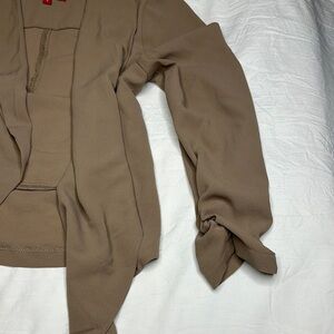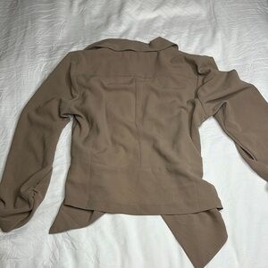 Like new. No rips, stains, tears or damages. No fading or pilling. Colour is Tan. Lightweight material with blazer jacket shape.