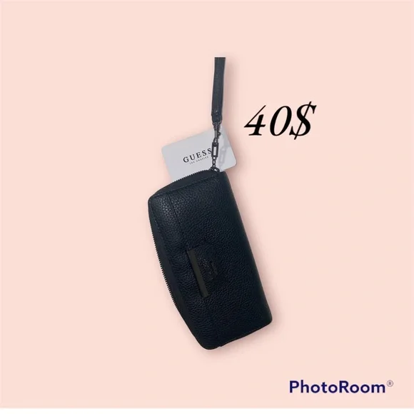 Smal GUESS Wristlet bag with black strap.