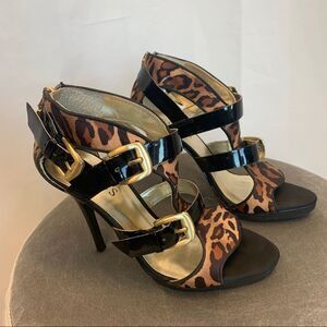 GUESS animal leopard cheetah print black patent strappy high heel sandal Sz 5.5
