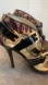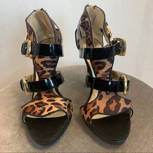 GUESS animal leopard cheetah print black patent strappy high heel sandal Sz 5.5