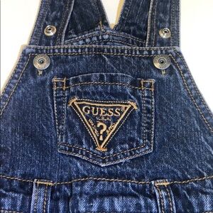 Designer GUESS beautifully fitted and good quality Jean material with leg 10 snaps for easy access in changing diapers Logo hardware of snaps on front bib and suspenders