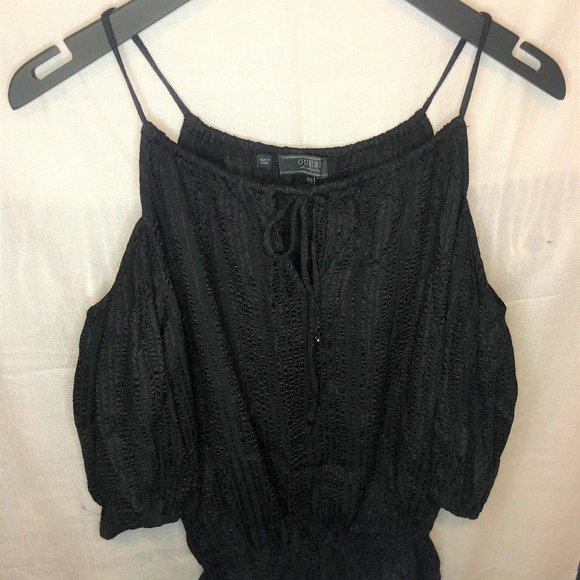 GUESS black cold shoulder knit top w/ tie front detail & ruched bottom; lightly worn