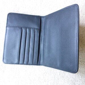 Holds your passport and has slots to hold your cards, metal "GUESS" hardware on the front.