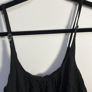 Black with under layer bodysuit And overhang black layer of somewhat sheer fabric Thong style & snap closure