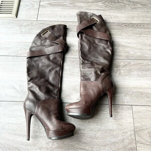 GUESS by Marciano Brown Buttery Leather Platform Heeled Knee High Boots