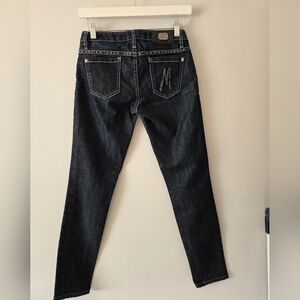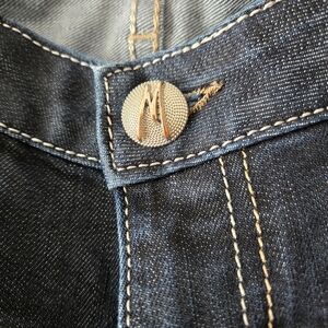 Stylish dark wash jeans. Features classic five-pocket design. Statement button and M design on back pocket.