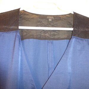 In very good condition! Closes in the front with a hook and eye closure. Deep v-neck, low cut blouse, features lace accents. Smooth, soft, silky material. Cute top for your next party, date night, or event