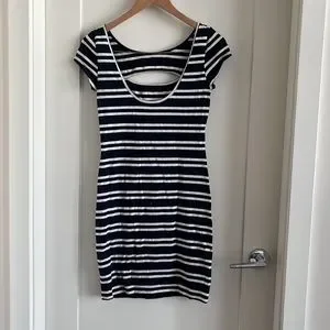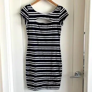 GUESS dress. Cutout detail on front and scoop back. Black and navy print. 96% cotton 4% spandex.