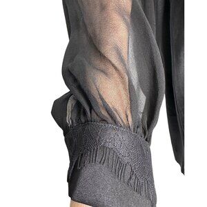 The top of the dress is sheer silk, then lace before the Silk Satin body. The sleeves are also Sheer Silk with feminine cuffs of Silk Satin with Lace overlay.