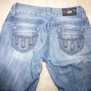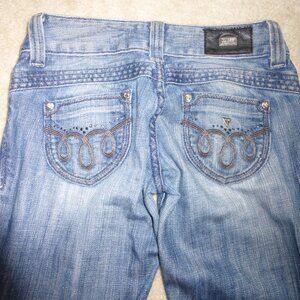 In good condition! Mid-rise style, some missing rhinestones on the front and back, wear on the hems. Still lots of life left!