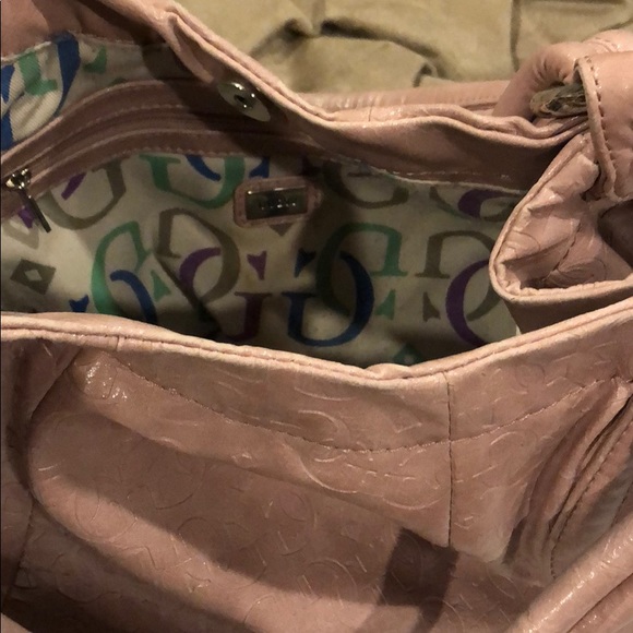 GUESS over the shoulder bag. There is one zipper pocket on one side inside the purse and 3 other open pockets on the other side. In good condition. Only gently used. Dust bag included.