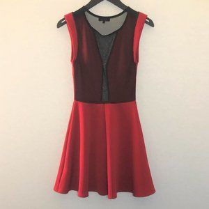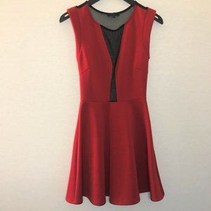 GUESS red flared scuba dress w mesh detailing; worn once to an event; show stopping colour & figure flattering detail, perfect for the holidays, weddings, or a night out