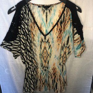 GUESS tropical-themed cold shoulder top w drawstring waist detail; worn once!