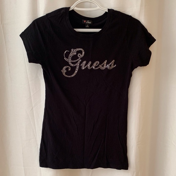 GUESS black t-shirt. Ladies small. Stretchy 100% cotton. All rhinestones are intact on the front. No stains or tears noted. Great pre-owned condition⭐️