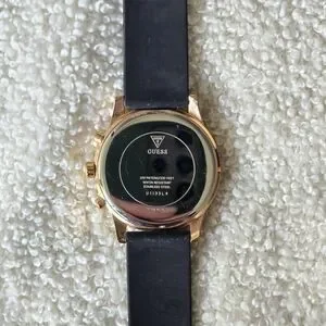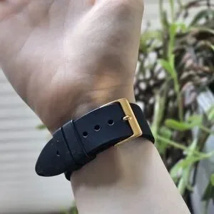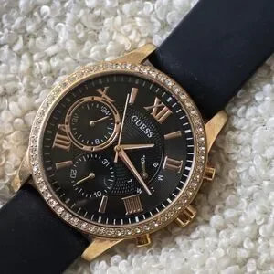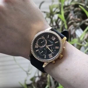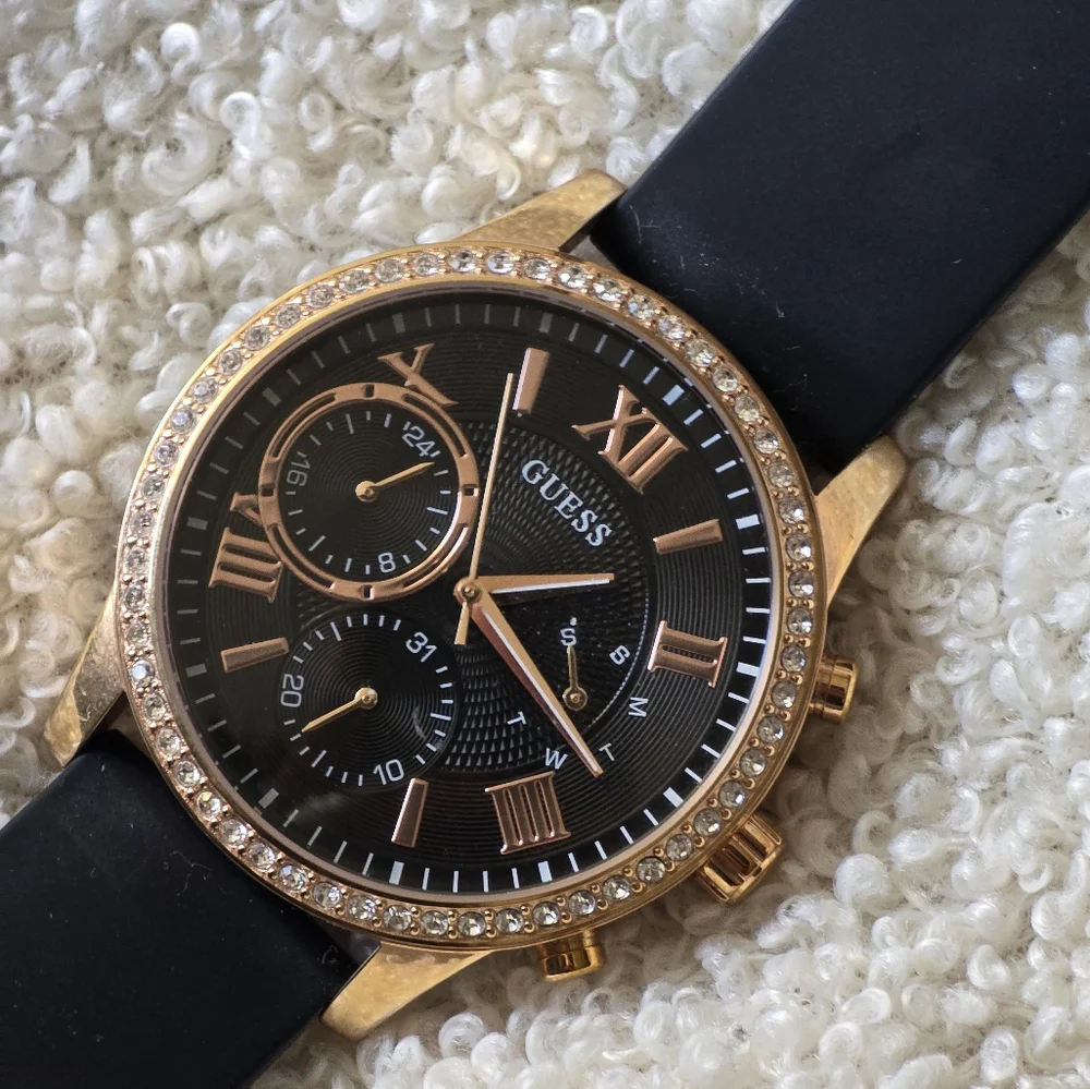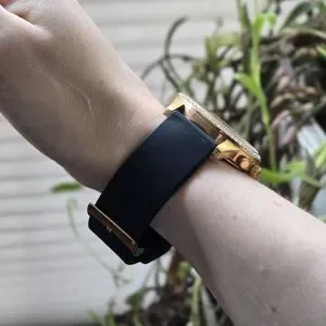 rose gold and diamond accents with black silicone adjustable wrist strap