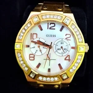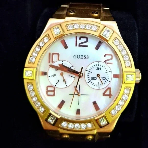 Guess watch, rose gold, mother of pearl, and crystal. comes with original box and extra links and hardware. Gently loved condition. offers always welcome!