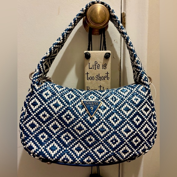 Stylish and versatile, this GUESS bag features a striking blue and white woven pattern. Perfect for any occasion, it adds a pop of colour to your outfit.