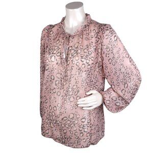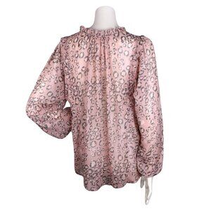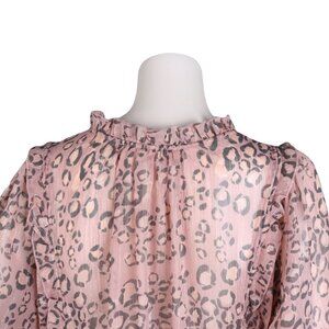GUEST EDITOR Sheer Leopard Print Blouse Metallic Thread Keyhole Ruffle Neck Pink