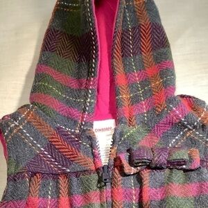 Gymboree “Fall Leaves & Flowers” quilted vest with hood. The plaid features bright pink, orange, green, and deep purple colours. The quilt lining is bright pink, with a zipper in front along with pockets and a bow.