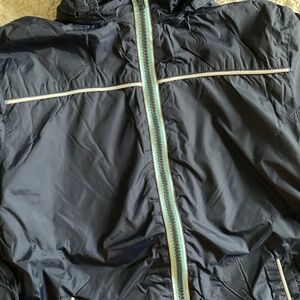 Zippered front, 2 side pockets, hood can be removed (see photo).